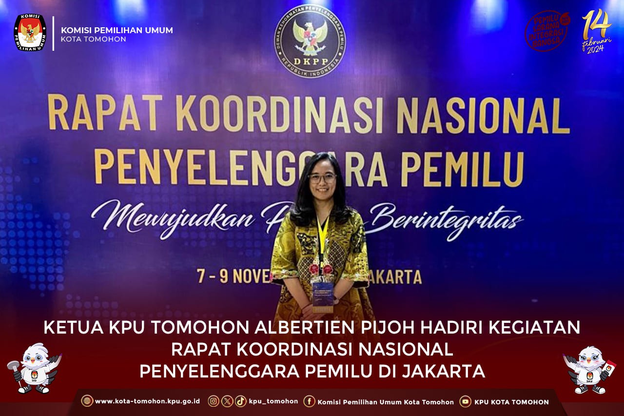 Tomohon, kota-tomohon.kpu.go.id - Ketua KPU Kota Tomohon Albertien Pijoh menghadiri kegiatan Rapat Koordinasi Nasional (Rakornas) Penyelenggara Pemilu yang diselenggarakan oleh Dewan Kehormatan Penyelenggara Pemilu (DKPP) Selasa (7/11/23) sampai Kamis (9/11/23) di Hotel Grand Sahid Jln. Sudirman, Jakarta.