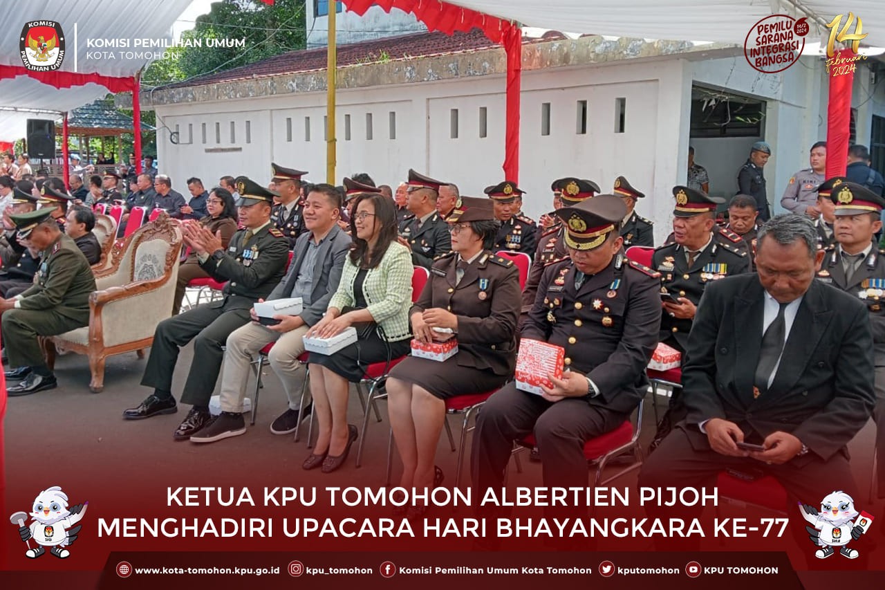 Tomohon, kota-tomohon.kpu.go.id - Ketua KPU Kota Tomohon Albertien G. V. Pijoh menghadiri upacara dan syukuran HUT Bhayangkara ke-77 di Lapangan Upacara Pemkot Tomohon, Sabtu (1/7/2023).