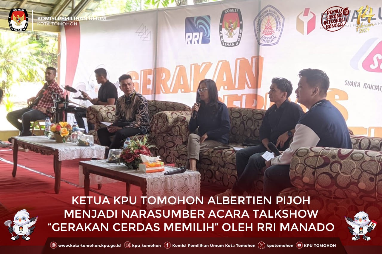 Tomohon, kota-tomohon.kpu.go.id - Ketua Komisi Pemilihan Umum Kota Tomohon Albertien G. V. Pijoh, menjadi narasumber pada acara Talkshow Gerakan Cerdas Memilih yang dilaksanakan oleh Radio Republik Indonesia (RRI) Kota Manado, yang berlangsung di Kampus Universitas Sariputra Indonesia Tomohon (UNSRIT), Selasa (22/8).