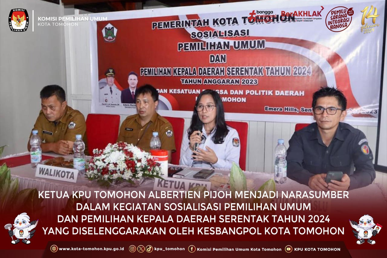 Ketua KPU Tomohon Albertien Pijoh Menjadi Narasumber dalam kegiatan Sosialisasi Pemilihan Umum dan Pemilihan Kepala Daerah Serentak Tahun 2024
