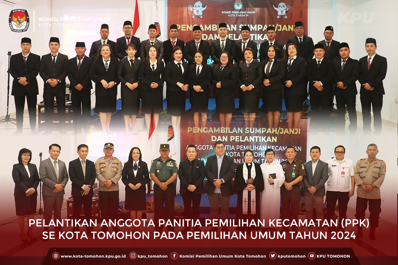 Tomohon, kota-tomohon.kpu.go.id - Ketua Komisi Pemilihan Umum Kota Tomohon Harryanto Lasut didampingi Anggota Stenly Kowaas, Robby Golioth, Jacobus Wowor dan Albertien Pijoh melantik 25 Anggota Panitia Pemilihan Kecamatan (PPK) yang telah terbentuk pada Desember 2022 yang lalu sesuai Surat Keputusan Komisi Pemilihan Umum Kota Tomohon Nomor 61 Tanggal 16 Desember 2022.