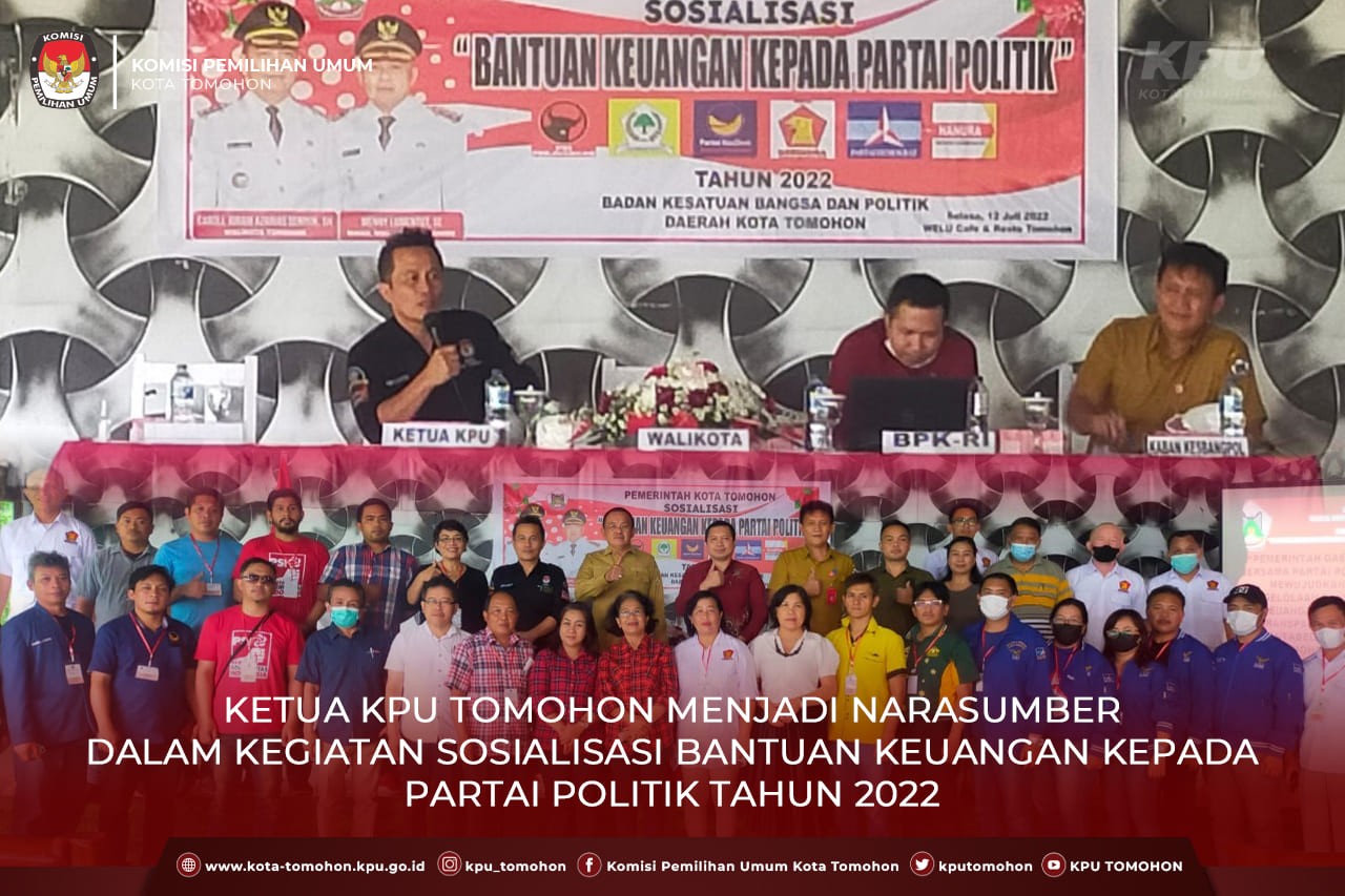 Tomohon, kota-tomohon.kpu.go.id - Selasa (12/7) Ketua KPU Tomohon Harryanto Lasut menghadiri undangan Pemerintah Kota Tomohon sebagai narasumber dalam kegiatan sosialisasi bantuan keuangan kepada partai politik tahun 2022, di Welu Cafe and Resto, Kelurahan Woloan Satu Utara, Kecamatan Tomohon Barat.