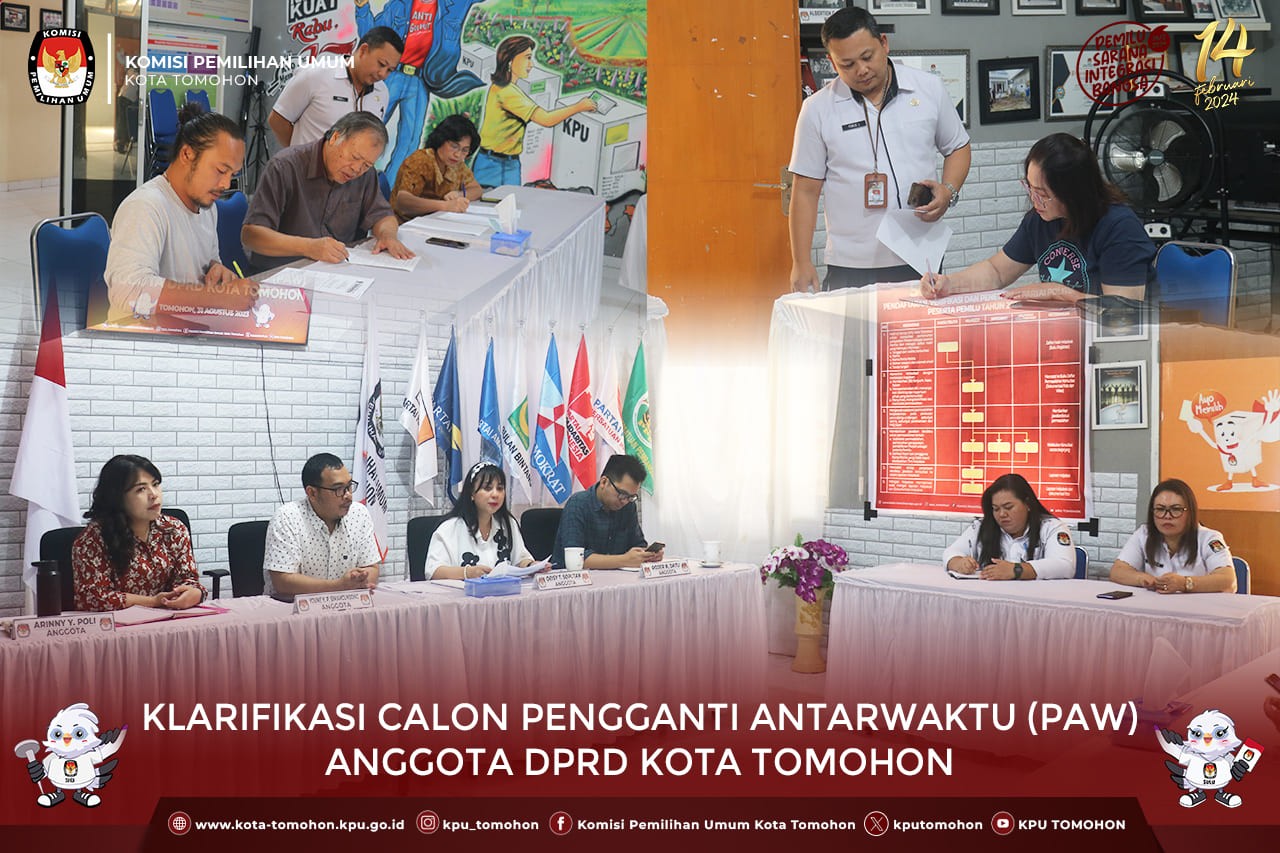 Tomohon, kota-tomohon.kpu.go.id - Menindaklanjuti Surat Pemohonan DPRD Kota Tomohon kepada KPU Kota Tomohon terkait permintaan nama Calon Pengganti Antar Waktu Anggota DPRD Kota Tomohon, maka KPU Kota Tomohon melaksanakan klarifikasi terhadap nama-nama yang berada pada posisi suara terbanyak kedua, bertempat di Kantor KPU Kota Tomohon, Kamis 31 Agustus 2023.