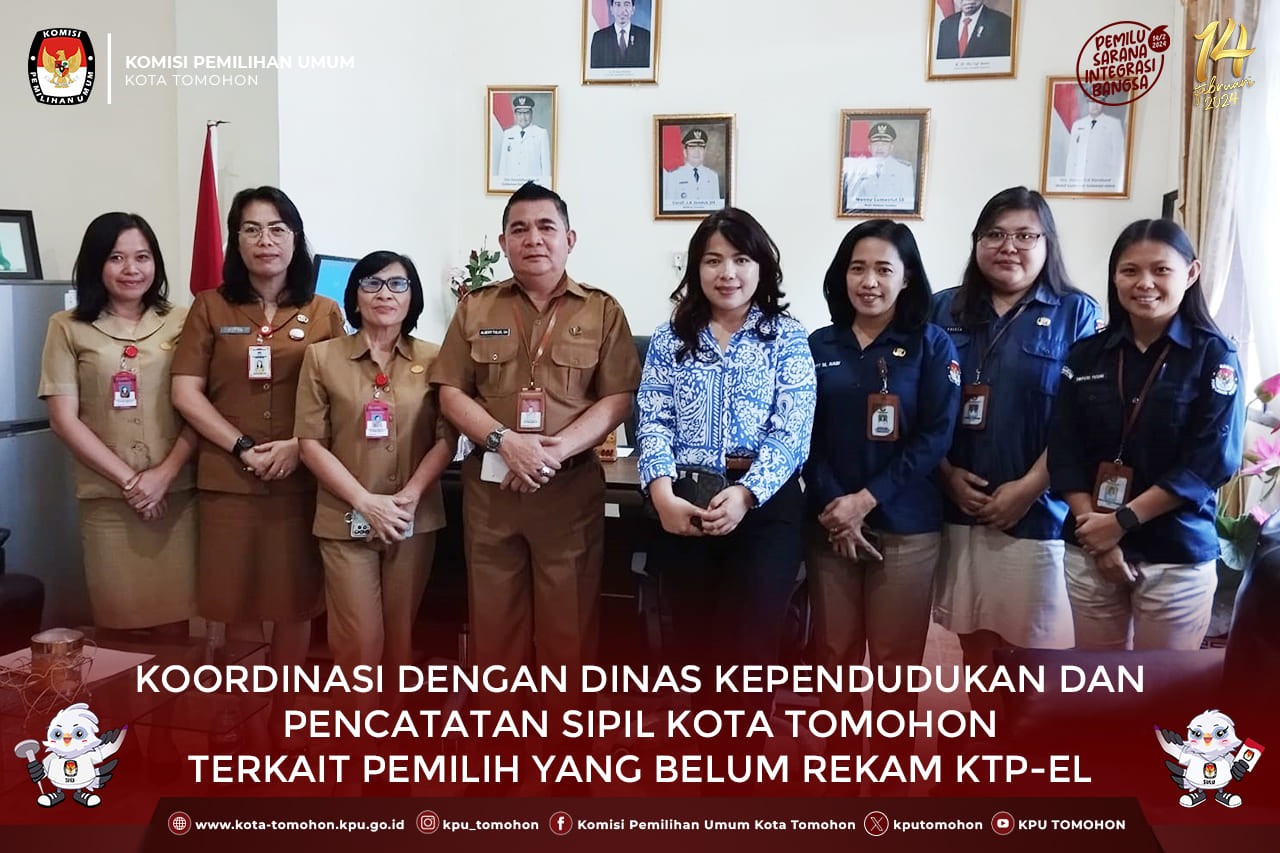 Tomohon, kota-tomohon.kpu.go.id - Ketua Divisi Perencanaan, Data dan Informasi Arinny Y. Poli didampingi Kepala Sub Bagian Perencanaan, Data dan Informasi Hetty M. Kabi beserta Operator Sidalih melakukan koordinasi dengan Dinas Kependudukan dan Pencatatan Sipil Kota Tomohon terkait pemilih yang belum melakukan perekaman KTP-EL.