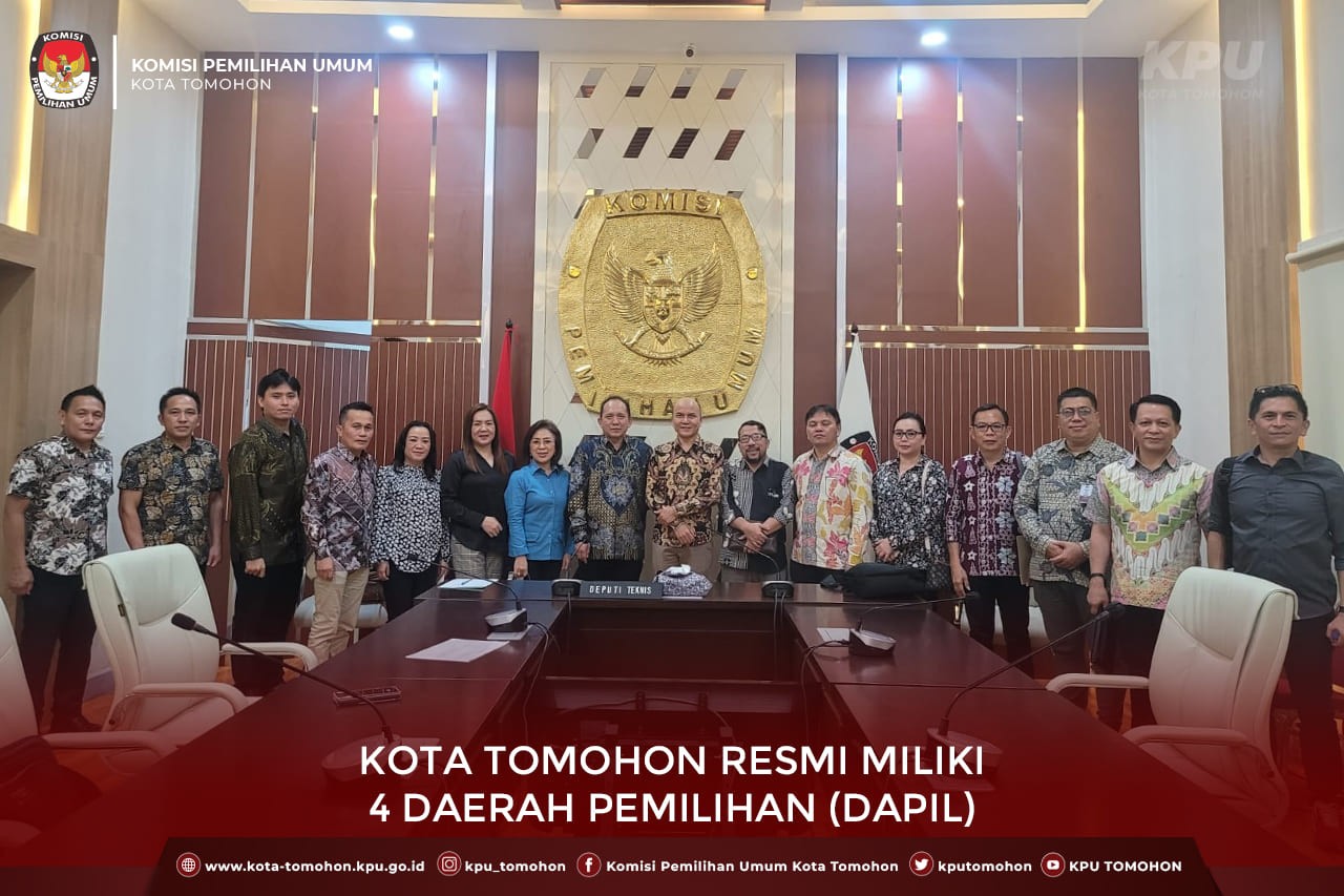 Tomohon, kota-tomohon.kpu.go.id - Perjuangan panjang agar supaya Kota Tomohon memiliki 4 Daerah Pemilihan (Dapil) di Pemilu 2024 akhirnya terwujud. Dalam audience antara KPU Provinsi Sulut, KPU Kota Tomohon, Pemkot dan DPRD Kota Tomohon dengan Deputi Teknis Eberta Kawima KPU RI, dipastikan bahwa Dapil Kota Tomohon menjadi 4.
