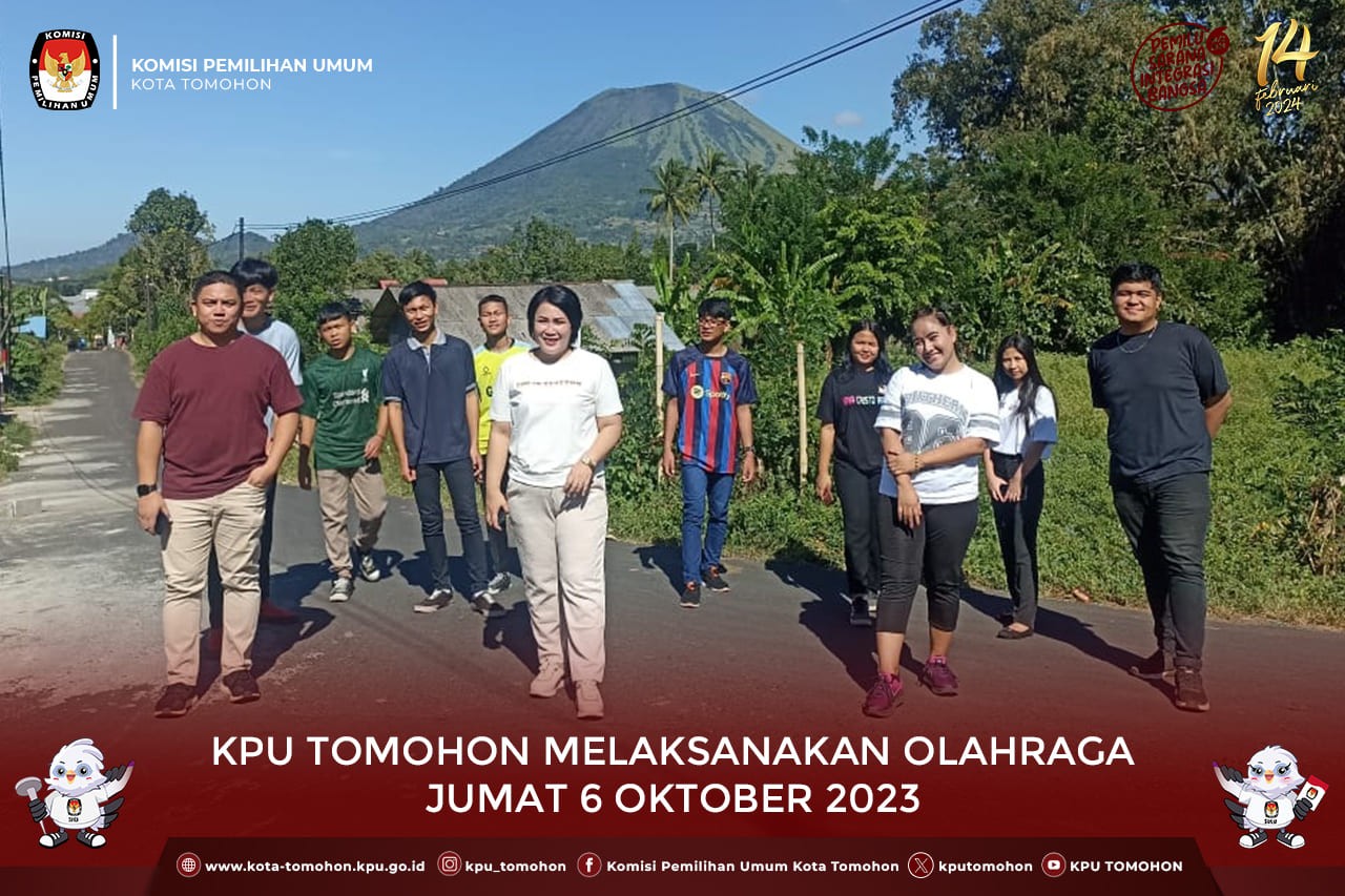 Tomohon, kota-tomohon.kpu.go.id - Menindaklanjuti Surat Dinas Sekretaris Jenderal Nomor 2963/SDM.07.1/-SD/04/2023 Tanggal 8 Agustus 2023 Perihal Pelaksanaan Olahraga pada Hari Jumat, KPU Kota Tomohon Melaksanakan Olahraga Jumat 06 Oktober 2023.