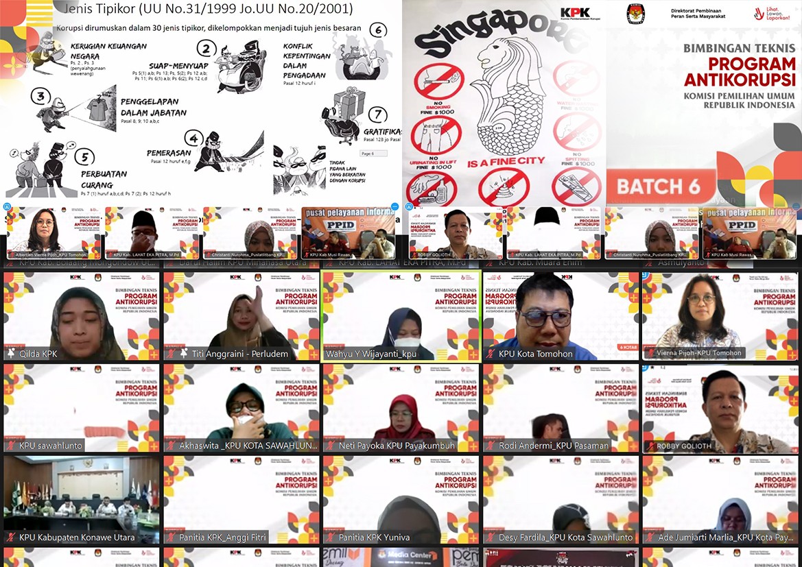 Tomohon, 07 Oktober 2021. Memenuhi undangan Komisi Pemilihan Umum Republik Indonesia Nomor: 540/SDM.03.1/13/2021 tanggal 17 September 2021, Ketua dan Anggota Komisi Pemilihan Umum Kota Tomohon mengikuti Bimbingan Teknis Program Anti Korupsi Batch 6, yang dilaksanakan secara daring melalui aplikasi Zoom Meeting. Narasumber dalam kegiatan ini dari Komisi Pemberantasan Korupsi (KPK) Qilda Fathiyah dan dari Perkumpulan untuk Pemilu dan Demokrasi (Perludem) Titi Anggraini.