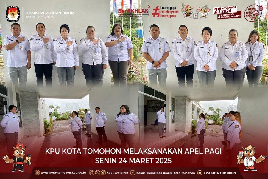 Apel pagi dimulai tepat pukul 08.00 WITA, dipimpin oleh Sekretaris KPU Tomohon Anita S. Tampi. Dalam amanatnya Tampi mengingatkan seluruh staf KPU untuk selalu menjaga kedisiplinan, meningkatkan koordinasi antar bagian serta terlibat aktif dalam pelaksanaan kegiatan di sepanjang minggu berjalan dimulai