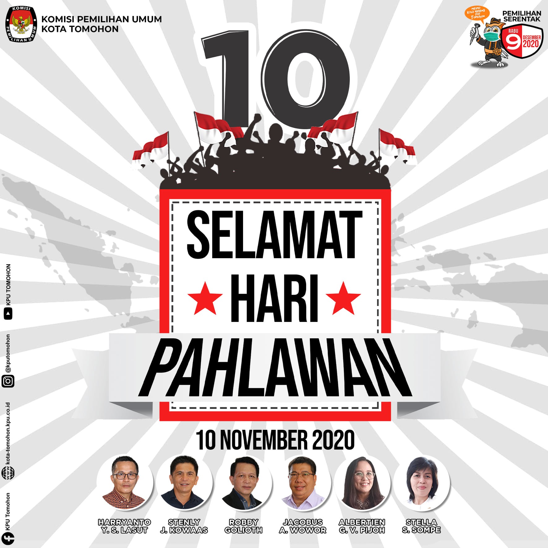 Komisi Pemilihan Umum (KPU) Kota Tomohon, hari ini 10 November 2020 memperingati Hari Pahlawan ke-75. Hari Pahlawan kiranya tidak hanya sekedar diingat pada setiap tanggal 10 November saja, namun lebih dari itu perjuangan dan pengorbanan para pahlawan yang telah rela mempertaruhkan nyawanya untuk mempertahankan kedaulatan Negara Kesatuan Republik Indonesia perlu terus dikenang sepanjang masa oleh kita semua.