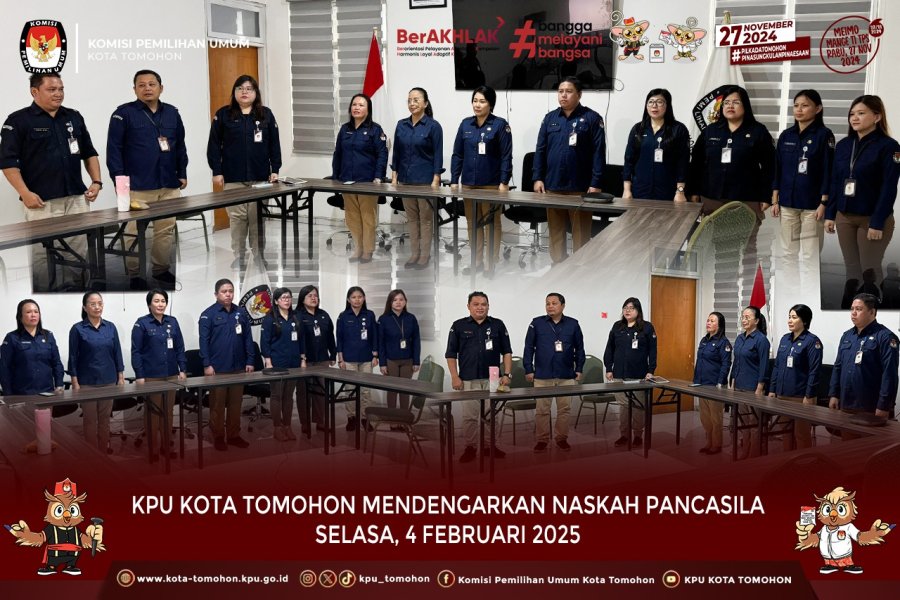 Menindaklanjuti Surat Dinas Sekretaris Jenderal Komisi Pemilihan Umum Nomor: 350/PK.02-SD/03/2025 tanggal 31 Januari 2025 Perihal: Pemberitahuan untuk Memperdengarkan Lagu Kebangsaan Indonesia Raya dan Naskah Lainnya, KPU Kota Tomohon Mendengarkan Naskah Pancasila pada Hari Selasa pada Pukul 10.00 WITA, Selasa 4 Februari 2025.