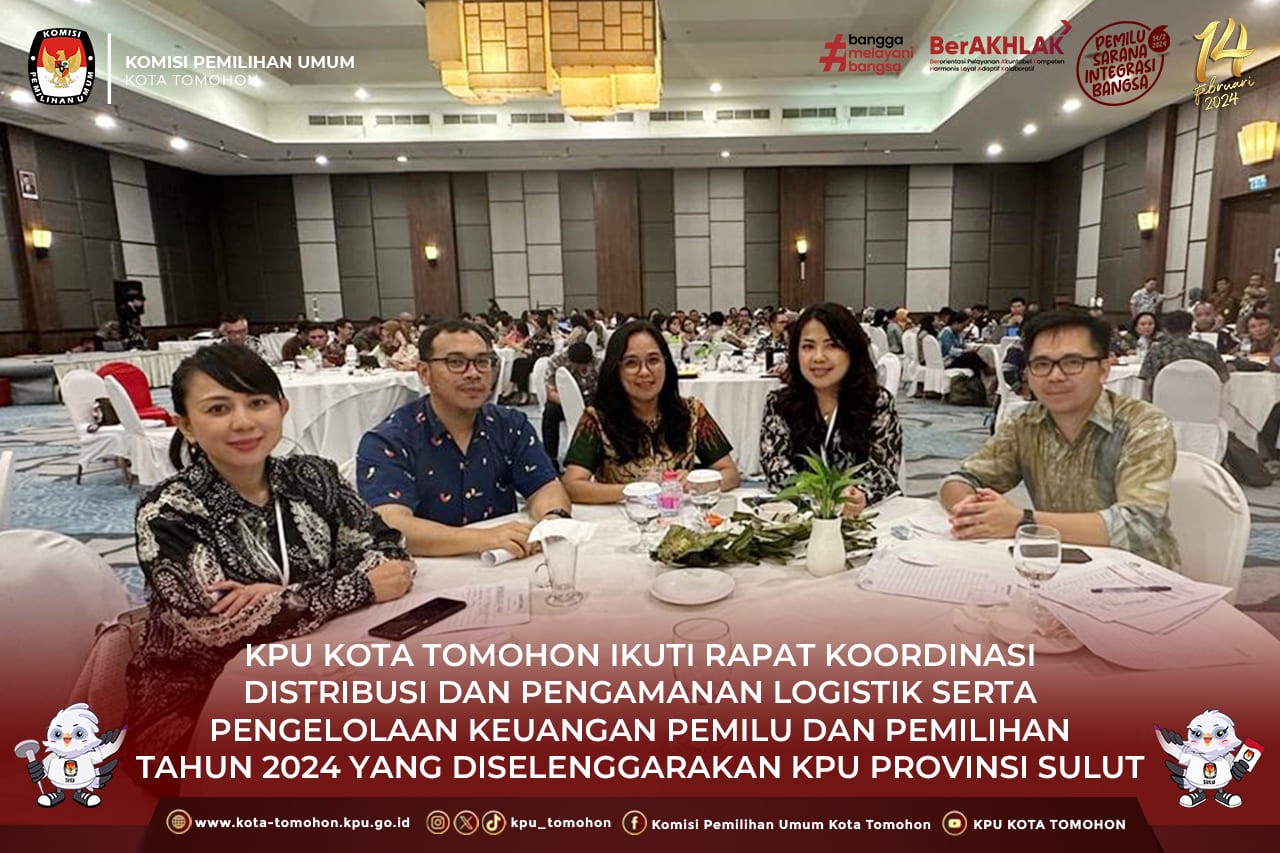Tomohon, kota-tomohon.kpu.go.id - Ketua KPU Kota Tomohon bersama anggota KPU Kota Tomohon di dampingi Sekretaris, Kepala Sub Bagian Keuangan Umum dan Logistik, Kepala Sub Bagian Teknis Penyelenggara Pemilu, Partisipasi dan Humas, Kepala Sub Bagian Perencanaan data dan Informasi, PPK, Bendahara serta operator Keuangan dan BMN KPU Kota Tomohon mengikuti Rapat Koordinasi Kesiapan Distribusi dan Pengamanan Logistik serta Pengelolaan Keuangan Pemilu dan Pemilihan Tahun 2024 yang dilaksanakan di Hotel Mercure Manado Tateli Beach Resort pada 23 s.d 25 November 2023.