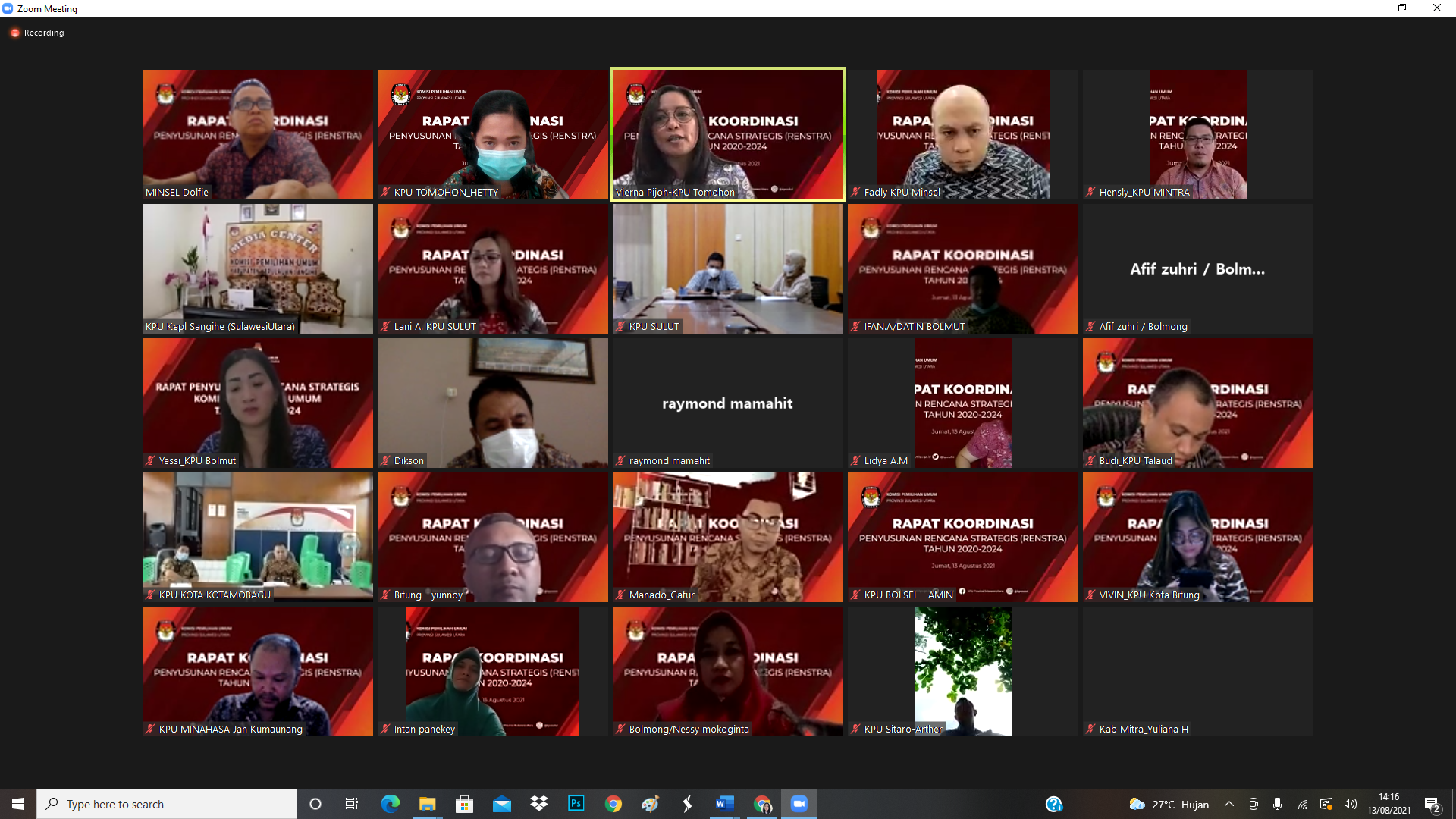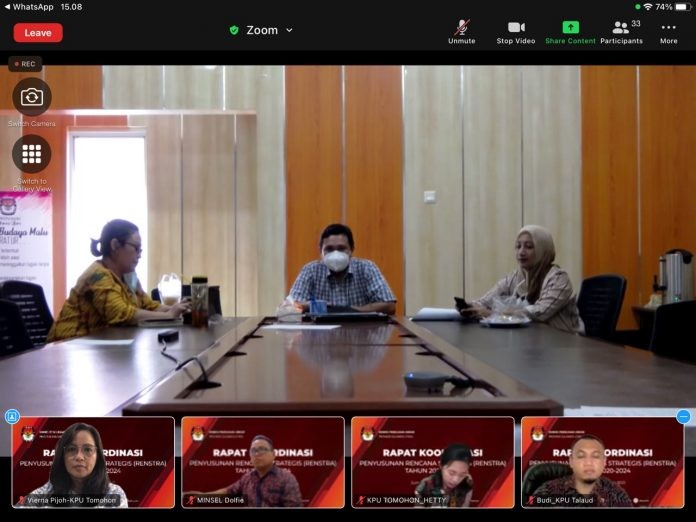 Jumat, 13 Agustus 2021. KPU Kota Tomohon mengikuti Rapat Koordinasi Penyusunan Rencana Strategis Komisi Pemilihan Umum Tahun 2020-2024 berdasarkan surat 306/PR.01-Und/71/Prov/VII/2021 yang diadakan KPU Provinsi Sulut secara daring. Kegiatan dihadiri oleh Ketua KPU Provinsi Sulut Ardiles Mewoh, Ketua Divisi Perencanaan, Data dan Informasi Lanny Ointu, Ketua Divisi Teknis Penyelenggara Yessy Momongan, Kabag Program, Data, Organisasi dan SDM Raymond Mamahit, Kasubag Program dan Data Lani Alouw, serta 15 KPU Kabupaten/Kota se-Sulawesi Utara yang diwakili oleh Ketua Divisi Perencanaan Data dan Informasi dan Kasubag Program dan Data.
