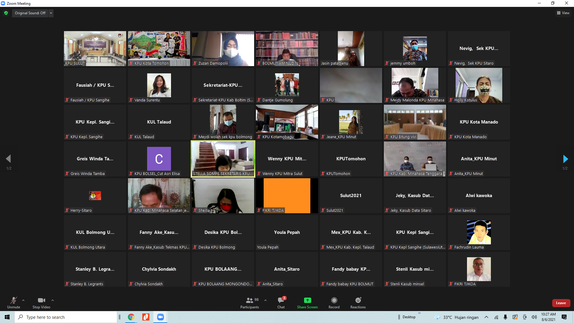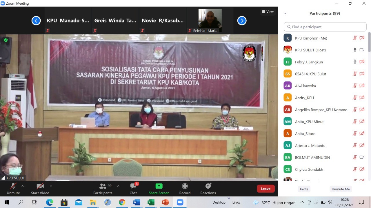 Jumat, 06 Agustus 2021. KPU Kota Tomohon mengikuti Sosialisasi Penyusunan Sasaran Kinerja Pegawai (SKP) yg dilaksanakan secara daring melalui aplikasi Zoom Meeting yang diikuti oleh seluruh ASN KPU Provinsi dan ASN di 15 kabupaten/Kota Se-Sulawesi Utara. Kegiatan tersebut di buka langsung oleh Sekretaris KPU Provinsi Sulawesi Utara, Ibu Pujiastuti, SE.