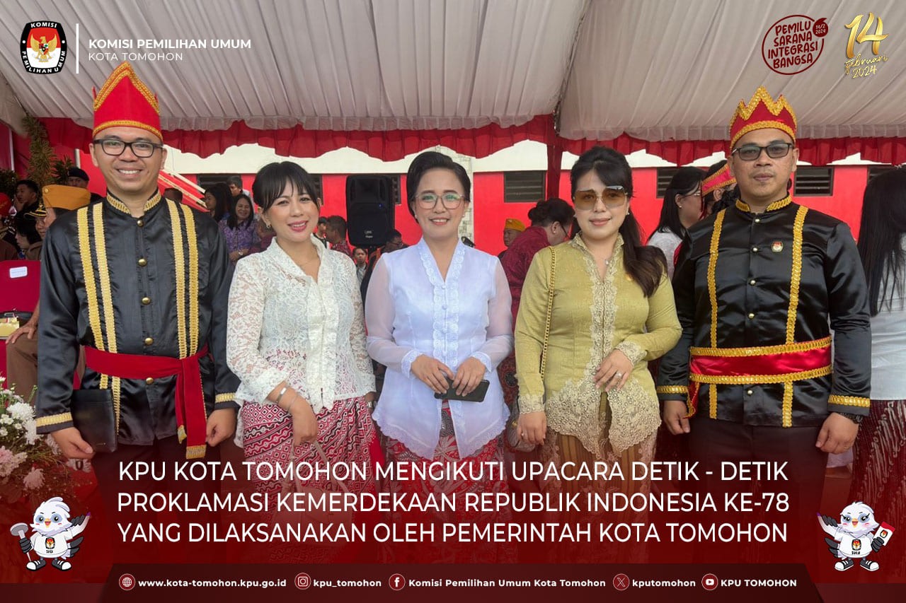 Tomohon, kota-tomohon.kpu.go.id - Ketua KPU Kota Tomohon Albertien G. V. Pijoh, Anggota Rojer R. Datu, Deisy T. Soputan, Arinny Y. Poli dan Youne Y. P. Simangunsong mengikuti secara langsung Upacara Peringatan Detik-Detik Proklamasi Kemerdekaan Republik Indonesia oleh Pemerintah Kota Tomohon, yang dilaksanakan di Stadion Babe Palar Tomohon, Kamis (17/8/2023).