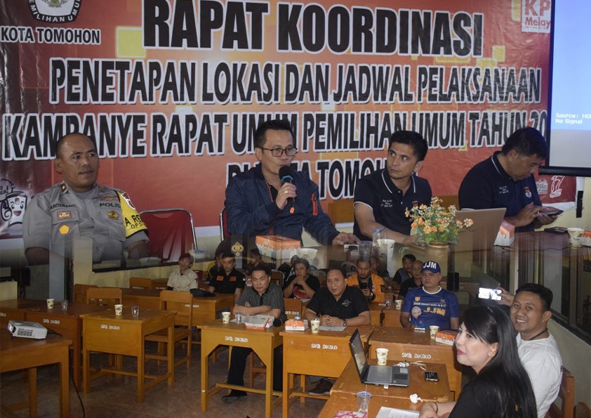 Tomohon, kpu-tomohon.com - Di tengah kesibukan mempersiapkan dan mengadakan kegiatan Simulasi Pemungutan dan Penghitungan Suara Pemilihan Umum Tahun 2019, Komisi Pemilihan Umum Kota Tomohon melaksanakan Rapat Koordinasi terkait penetapan lokasi dan jadwal pelaksanaan kampanye. Rapat umum ini dilaksanakan pada hari dan tempat yang sama ketika diadakan Simulasi.