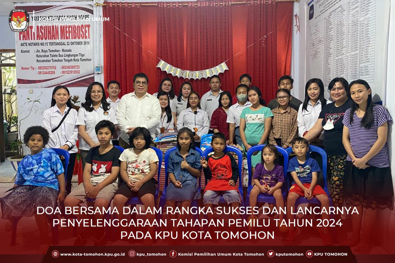 Tomohon, kota-tomohon.kpu.go.id - KPU Kota Tomohon gelar doa bersama dan pemberian santunan bagi anak yatim, dalam rangka sukses dan lancarnya penyelenggaraan tahapan pemilu tahun 2024. Kegiatan yang mengusung tema “Melayani dengan kasih untuk mewujudkan pemilu yang langsung, umum, bebas, rahasia, jujur dan adil” dilaksanakan di Panti Asuhan Mefiboset, Senin (22/8).