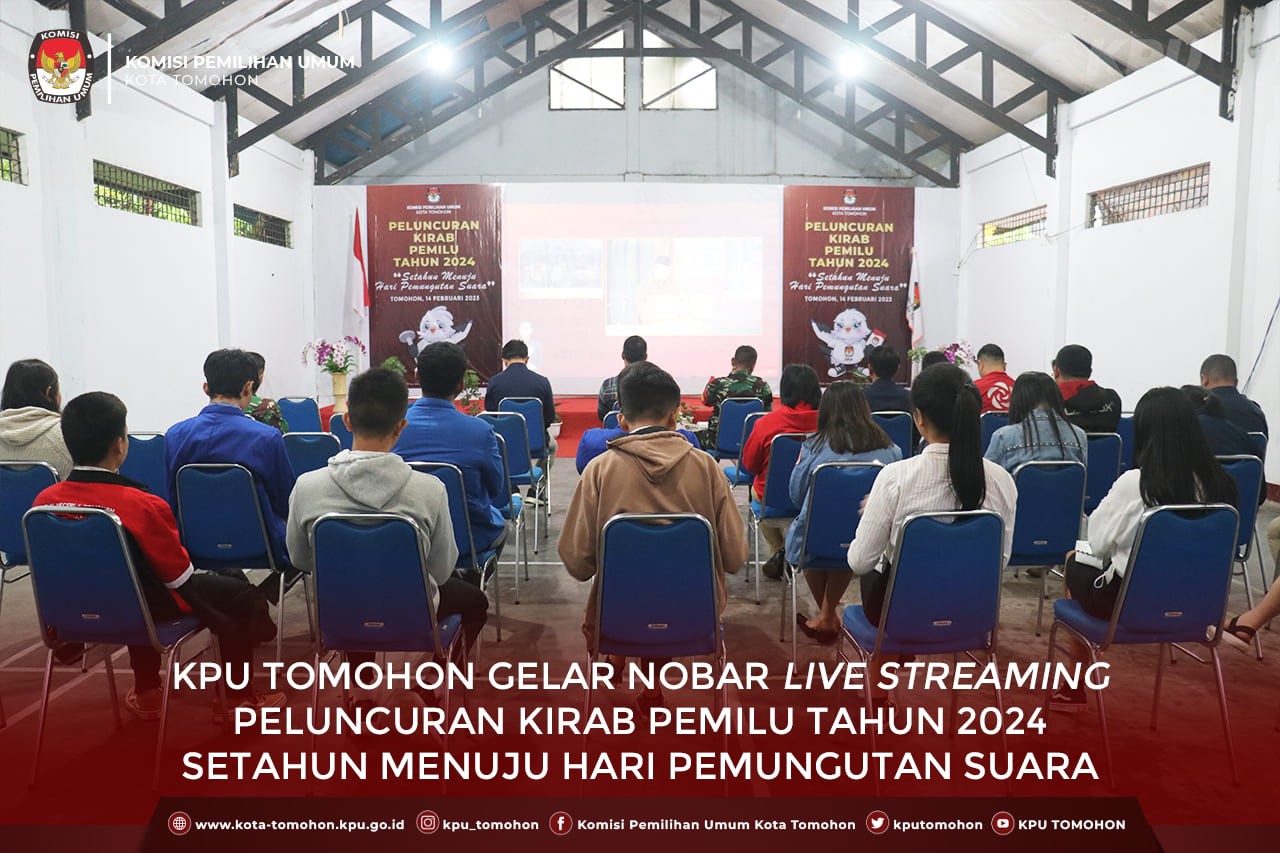 Tomohon, kota-tomohon.kpu.go.id - Komisi Pemilihan Umum Kota Tomohon menggelar Nonton Bareng Live Streaming Peluncuran Kirab Pemilu Tahun 2024: Setahun Menuju Hari Pemungutan Suara dengan tema: "Pemilu Sebagai Sarana Integrasi Bangsa." bertempat di Kantor KPU Kota Tomohon dengan mengundang Bawaslu Kota Tomohon, Forkopimda, Partai Politik, Media/Wartawan serta Siswa-siswi, Selasa (14/2).