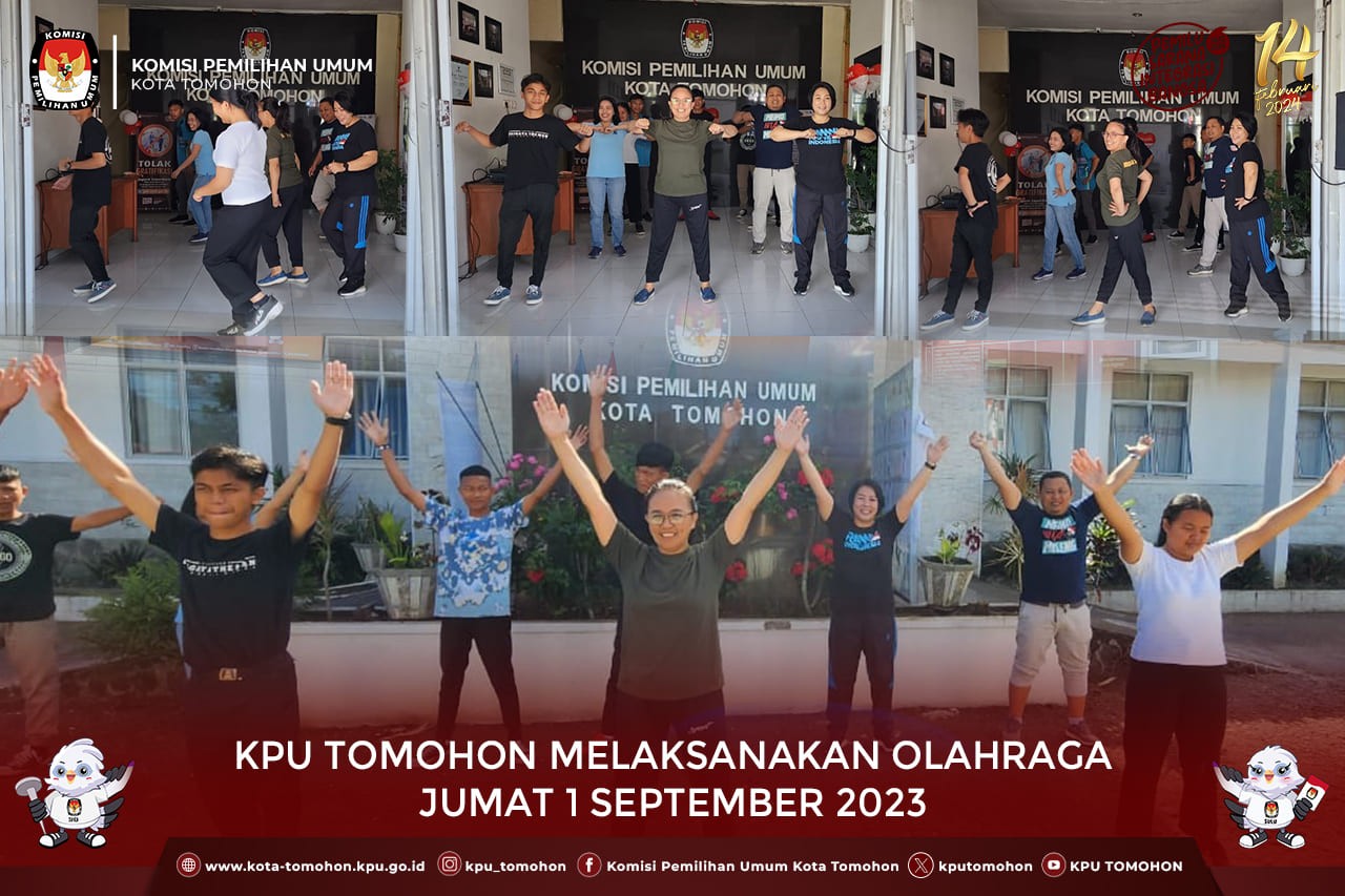 Tomohon, kota-tomohon.kpu.go.id - Menindaklanjuti Surat Dinas Sekretaris Jenderal Nomor 2963/SDM.07.1-SD/04/2023 Tanggal 8 Agustus 2023 Perihal Pelaksanaan Olahraga pada Hari Jumat, KPU Kota Tomohon Melaksanakan Olahraga Jumat 1 September 2023.
