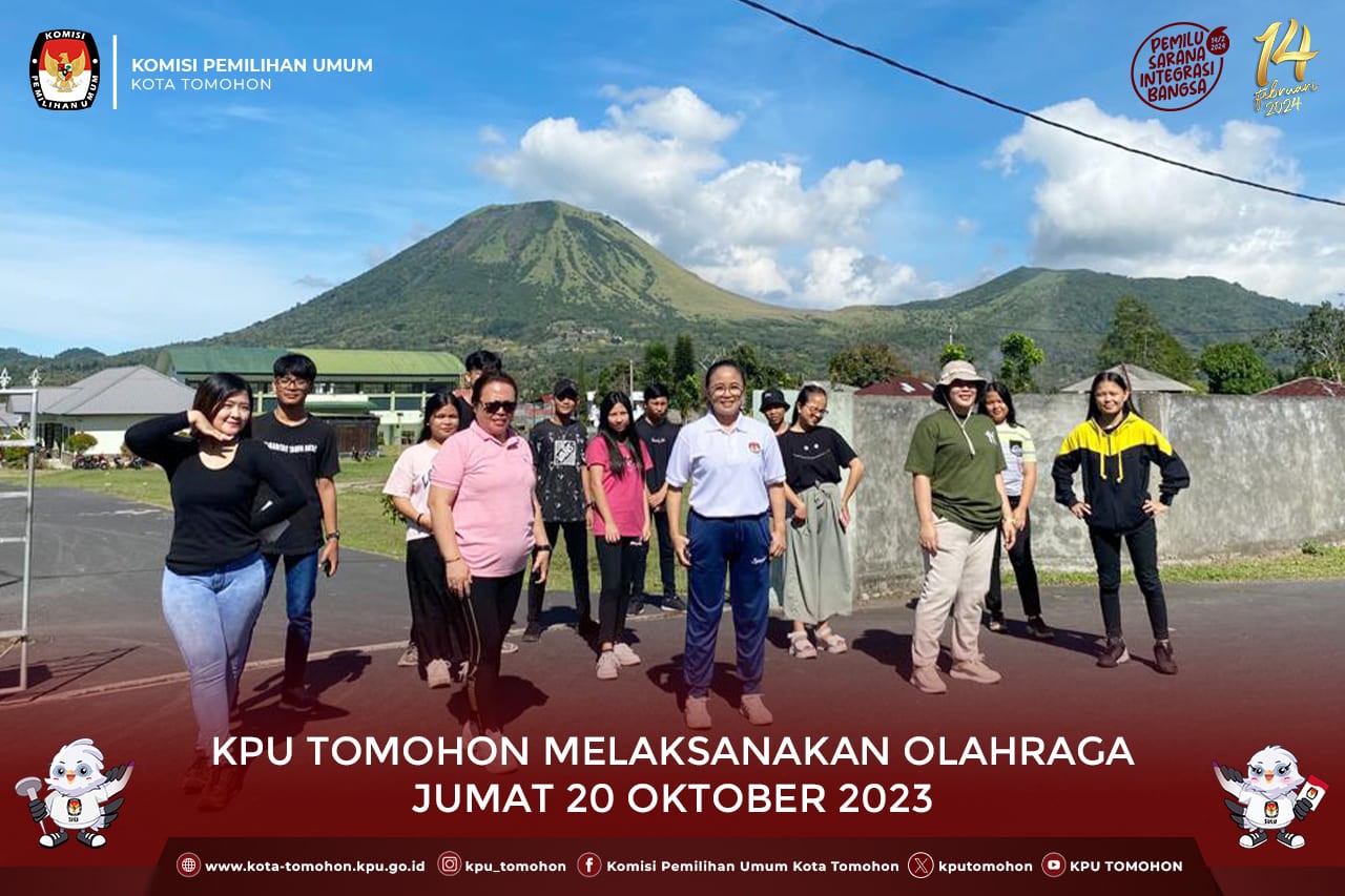 Tomohon, kota-tomohon.kpu.go.id - Menindaklanjuti Surat Dinas Sekretaris Jenderal Nomor 2963/SDM.07.1/-SD/04/2023 Tanggal 8 Agustus 2023 Perihal Pelaksanaan Olahraga pada Hari Jumat, KPU Kota Tomohon Melaksanakan Olahraga Jumat 20 Oktober 2023.