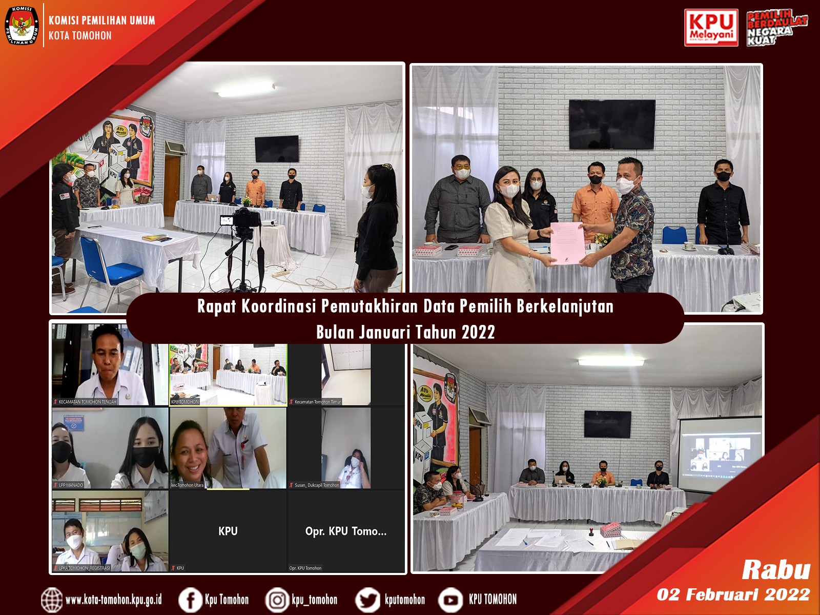 Tomohon, kota-tomohon.kpu.go.id - KPU Kota Tomohon melaksanakan Rapat Koordinasi terkait Daftar Pemilih berkelanjutan Tahun 2022 Periode Januari yang dilaksanakan tiap 3 bulan sekali, dengan mengundang stakeholder terkait diantaranya Bawaslu Kota Tomohon, Dinas Kependudukan dan Catatan Sipil Kota Tomohon Lembaga pemasyarakatan Perempuan, Lembaga Pembinaan Khusus Anak Kota Tomohon, Camat se-Kota Tomohon.