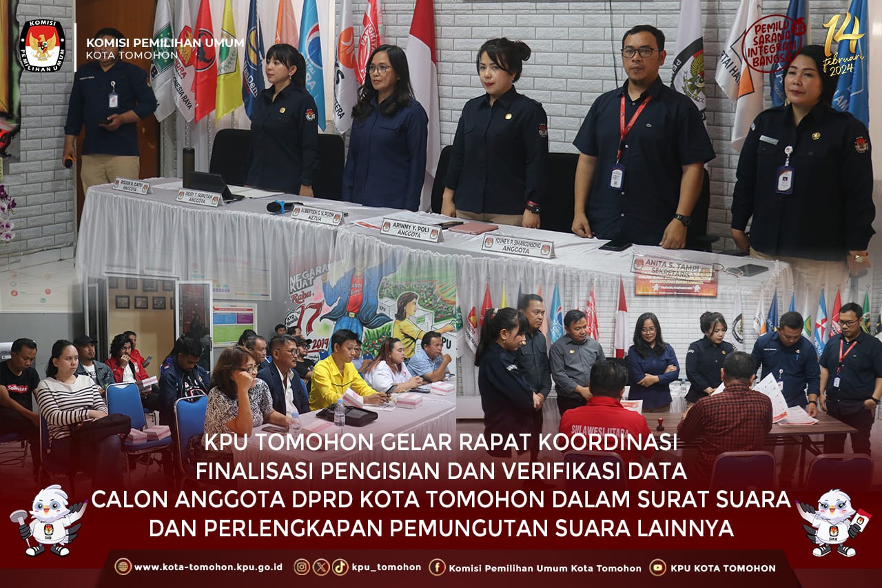 Tomohon, kota-tomohon.kpu.go.id - Komisi Pemilihan Umum (KPU) Kota Tomohon melaksanakan kegiatan Rapat Koordinasi Finalisasi Pengisian dan Verifikasi Data Calon Anggota DPRD Kota Tomohon dalam Surat Suara dan Perlengkapan Pemungutan Suara Lainnya bersama perwakilan dari 12 Partai Politik, Selasa 31 Oktober 2023