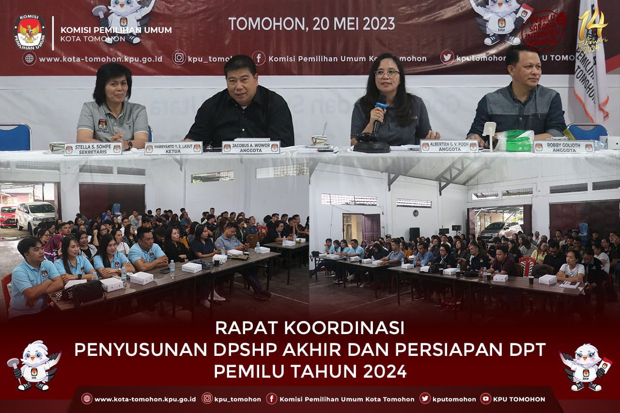 Tomohon, kota-tomohon.kpu.go.id - KPU Tomohon menggelar Rapat Koordinasi Penyusunan Daftar Pemilih Sementara Hasil Perbaikan (DPSHP) Akhir dan Persiapan Daftar Pemilih Tetap (DPT) Pemilu Tahun 2024 bertempat di Kantor KPU Kota Tomohon, Sabtu (20/5). Rakor diikuti oleh Panitia Pemilihan Kecamatan (PPK) se-Kota Tomohon bersama PPS yang membidangi Data Pemilih. Kegiatan Rakor dipimpin langsung oleh Kadiv Perencanaan, Data dan Informasi Albertien Pijoh.