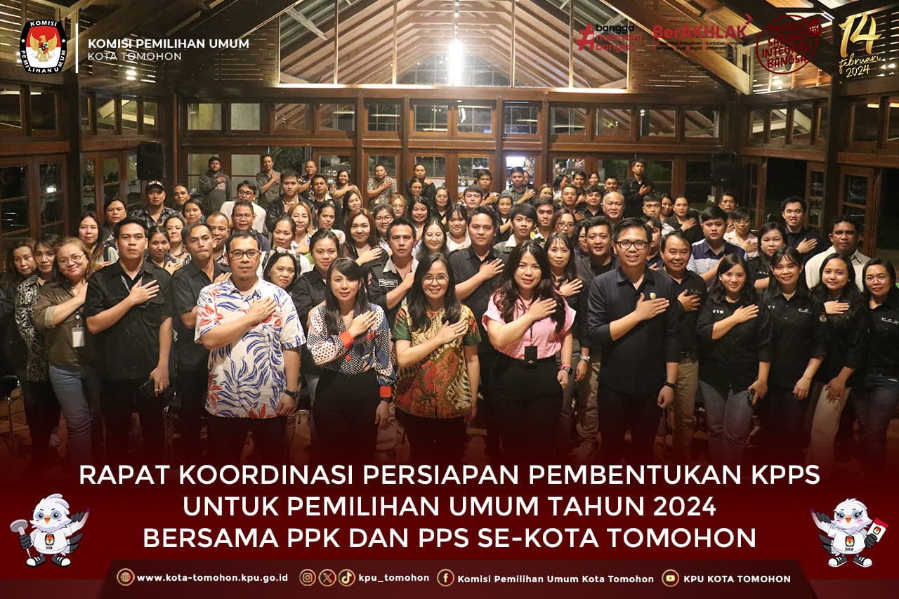 Tomohon, kota-tomohon.kpu.go.id - Komisi Pemilihan Umum Kota Tomohon menggelar Rapat Koordinasi Persiapan Pembentukan Kelompok Penyelenggara Pemungutan Suara (KPPS) kepada Panitia Pemilihan Kecamatan (PPK) dan Panitia Pemungutan Suara (PPS) se-Kota Tomohon untuk Pemilihan Umum Tahun 2024, di Taman Kelong Jumat (08/12/2023).