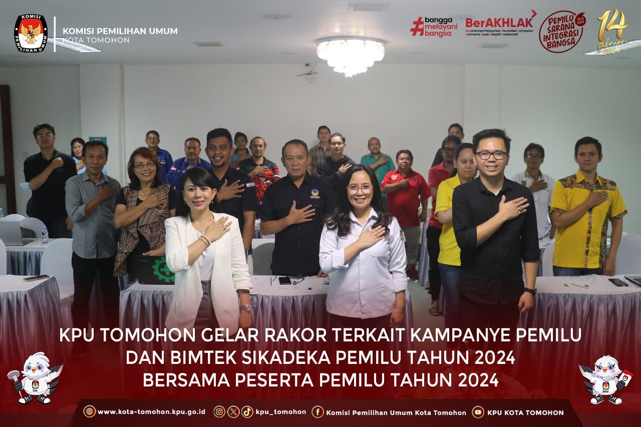 Tomohon, kota-tomohon.kpu.go.id - Komisi Pemilihan Umum (KPU) Kota Tomohon melaksanakan kegiatan Rapat Koordinasi terkait Kampanye Pemilu dan Bimbingan Teknis Sistem Informasi Kampanye dan Dana Kampanye (SIKADEKA) Pemilu Tahun 2024 bersama Peserta Pemilu Tahun 2024, Kamis 23 November 2023 bertempat di Grand Master Resort Tomohon.
