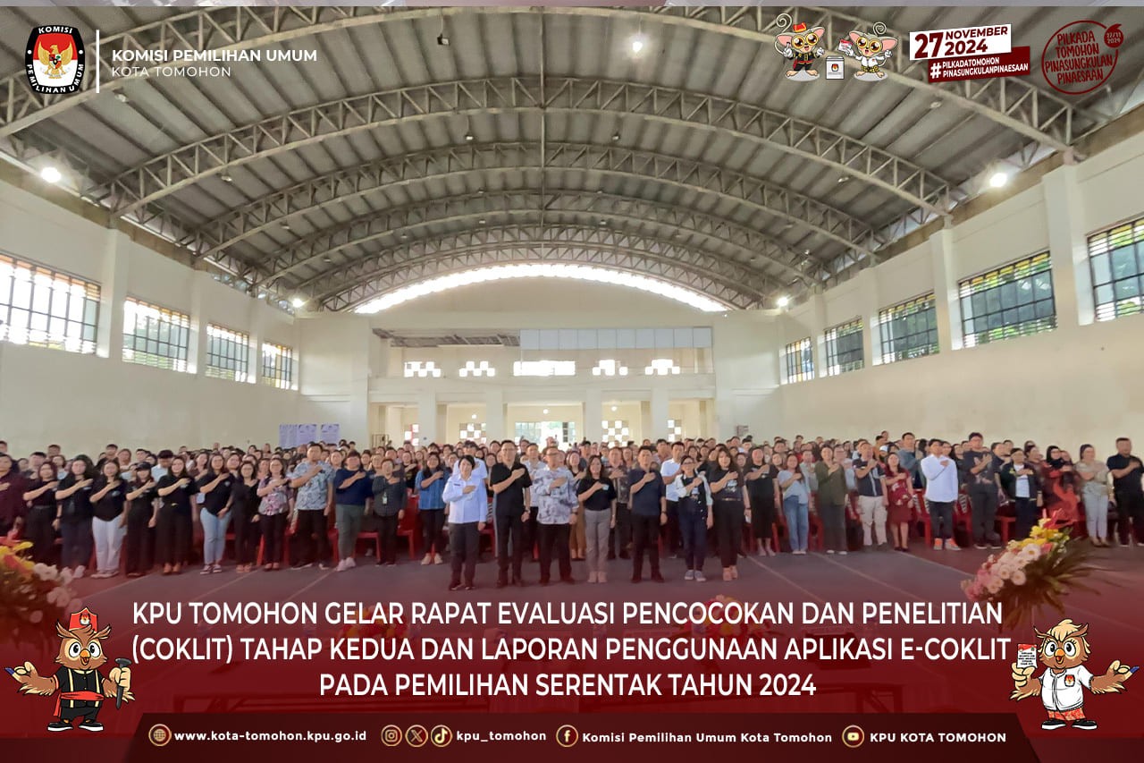 Tomohon, kota-tomohon.kpu.go.id - Komisi Pemilihan Umum (KPU) Kota Tomohon menggelar kegiatan Rapat Evaluasi Pencocokan dan Penelitian (Coklit) Tahap Kedua dan Laporan Penggunaan Aplikasi E-Coklit pada Pemilihan Serentak Tahun 2024, bertempat di GOR Babe Palar.