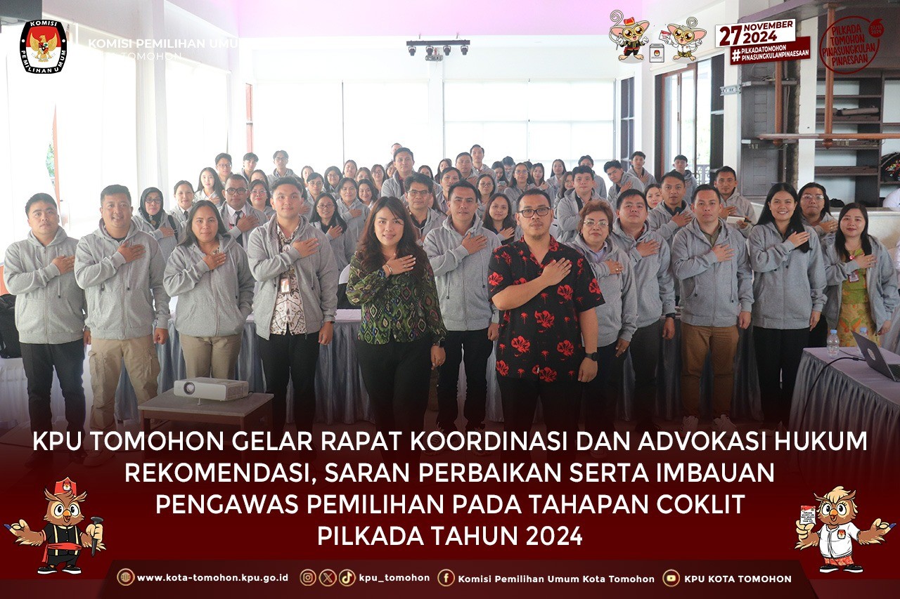 KPU Tomohon Gelar Rapat Koordinasi dan Advokasi Hukum Rekomendasi, Saran Perbaikan serta Imbauan Pengawas Pemilihan pada Tahapan Coklit Pilkada Tahun 2024