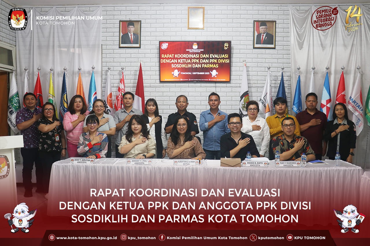Tomohon, kota-tomohon.kpu.go.id - Komisi Pemilihan Umum (KPU) Kota Tomohon melaksanakan Kegiatan Rapat Koordinasi dan Evaluasi dengan Ketua PPK dan Anggota PPK Divisi Sosialisasi, Pendidikan Pemilih dan Partisipasi Masyarakat Se-Kota Tomohon, Jumat 01/09/23