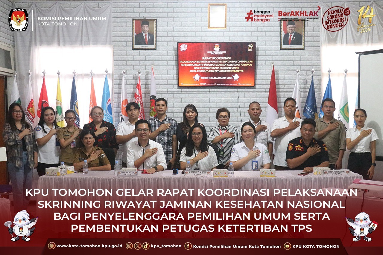 Tomohon, kota-tomohon.kpu.go.id - KPU Tomohon gelar Rapat Koordinasi (Rakor) Pelaksanaan Skrining Riwayat Kesehatan dan Optimalisasi Kepesertaan Aktif Program Jaminan Kesehatan Nasional bagi Penyelenggara Pemiihan Umum serta Pembentukan Petugas Ketertiban TPS di Kantor KPU Tomohon pada Senin, 8 Januari 2024.