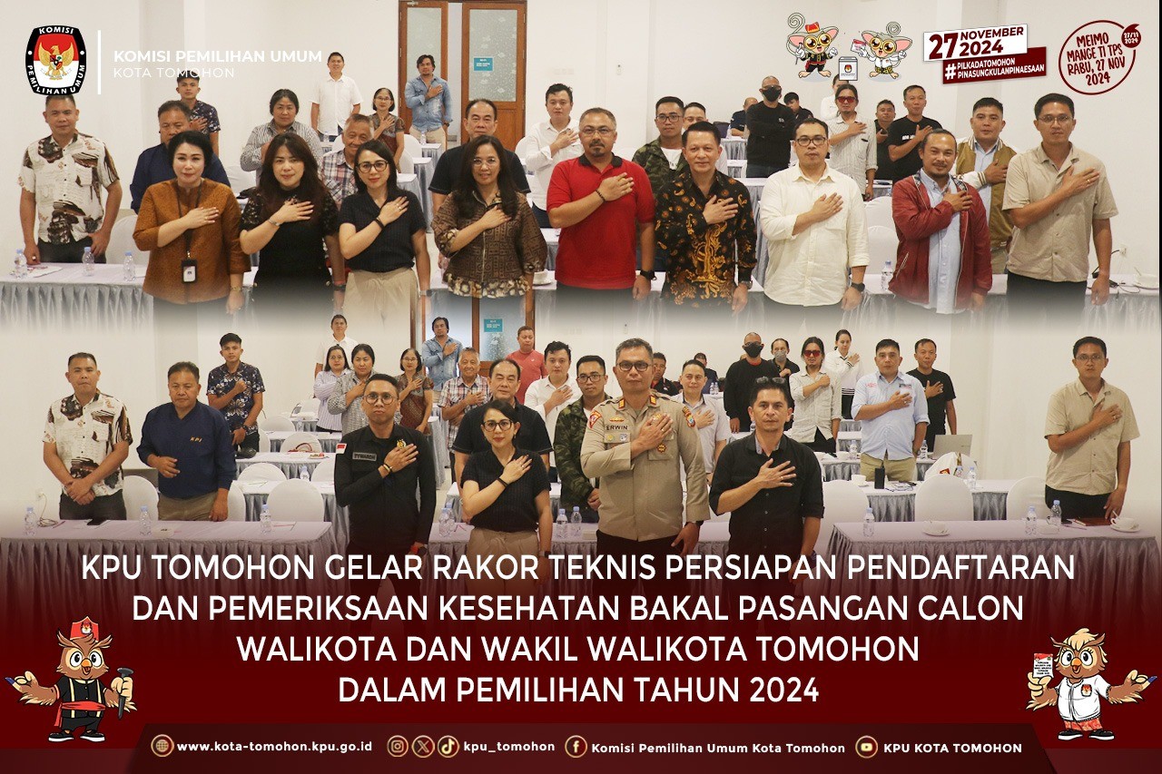 Tomohon, kota-tomohon.kpu.go.id - KPU Kota Tomohon menggelar Rapat Koordinasi Teknis Persiapan Pendaftaran dan Pemeriksaan Kesehatan Bakal Pasangan Calon Walikota dan Wakil Walikota Tomohon dalam Pemilihan Tahun 2024, di Grand Master Resort, Sabtu (24/08/2024).