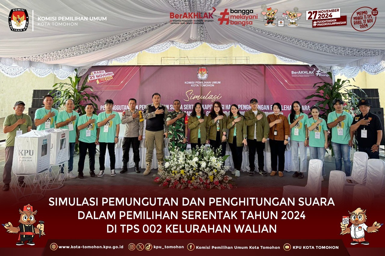 Tomohon, kota-tomohon.kpu.go.id - Komisi Pemilihan Umum (KPU) menggelar Simulasi Pemungutan dan Penghitungan Suara serta Rekapitulasi Hasil Penghitungan Suara dalam Pemilihan Serentak Tahun 2024 di TPS 002 Kelurahan Walian, bertempat di GOR Babe Palar Kota Tomohon, Jumat (15/11/2024).