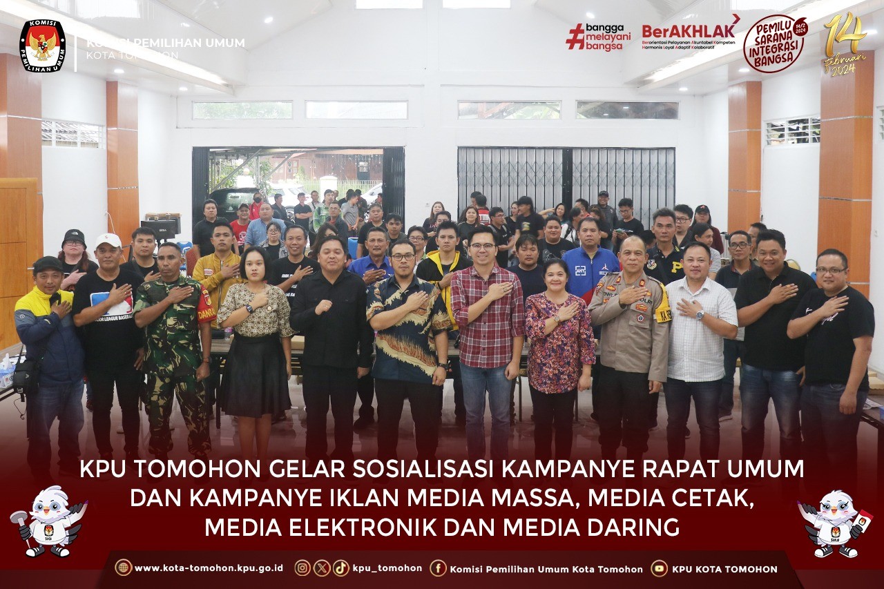 Tomohon, kota-tomohon.kpu.go.id - Komisi Pemilihan Umum (KPU) Kota Tomohon menggelar Sosialisasi Kampanye Rapat Umum dan Kampanye Iklan Media Massa, Media Cetak, Media Elektronik dan Media Daring dalam pemilihan Umum Tahun 2024, di Aula Kantor KPU Kota Tomohon, Jumat (19/1/2024).