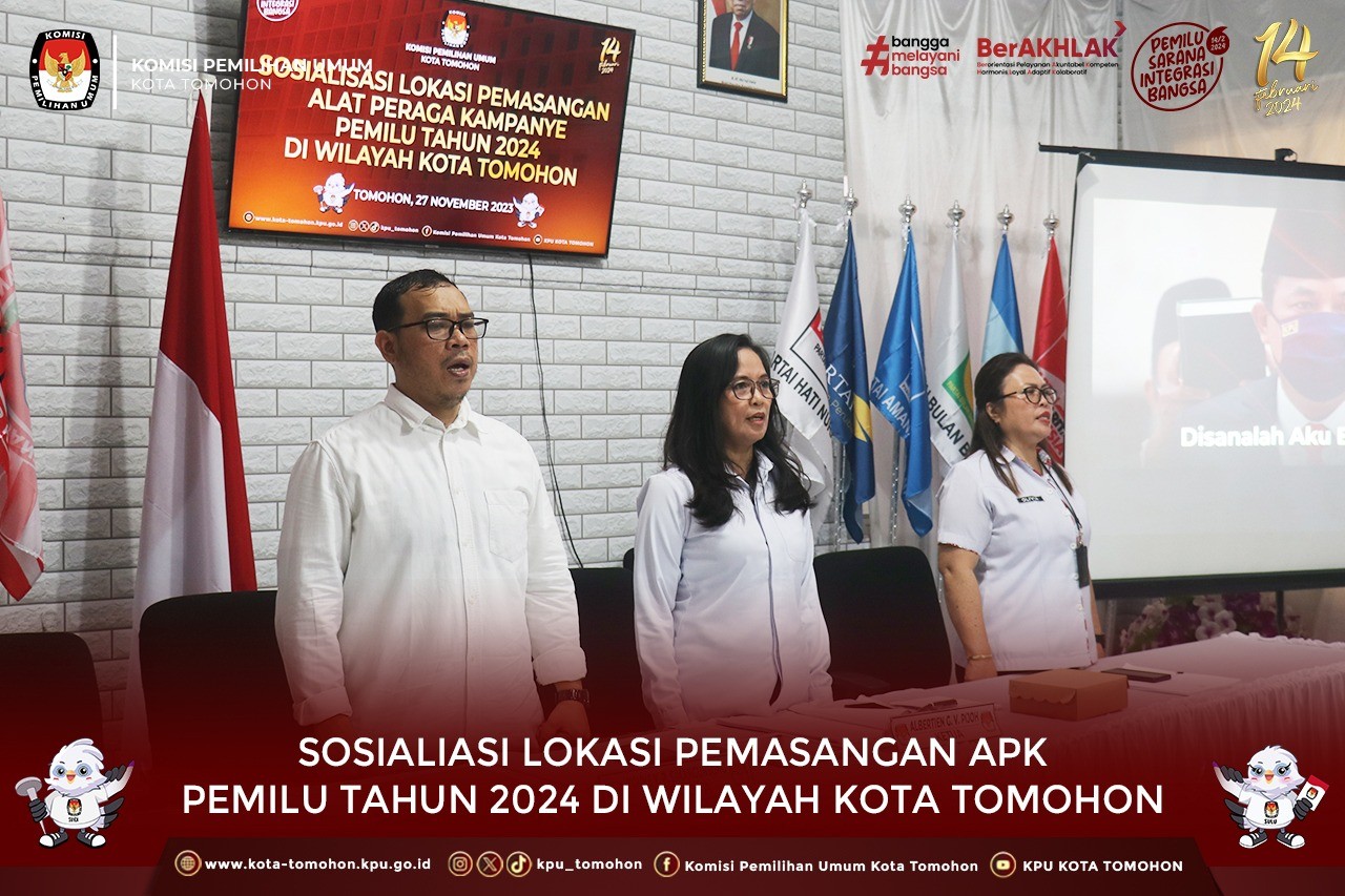 Tomohon, kota-tomohon.kpu.go.id - Komisi Pemilihan Umum (KPU) Kota Tomohon melaksanakan kegiatan Sosialisasi Lokasi Pemasangan Alat Peraga Kampanye Pemilu Tahun 2024 di wilayah Kota Tomohon, Senin 27 November 2023 bertempat di Ruang Rapat Kantor KPU Kota Tomohon.