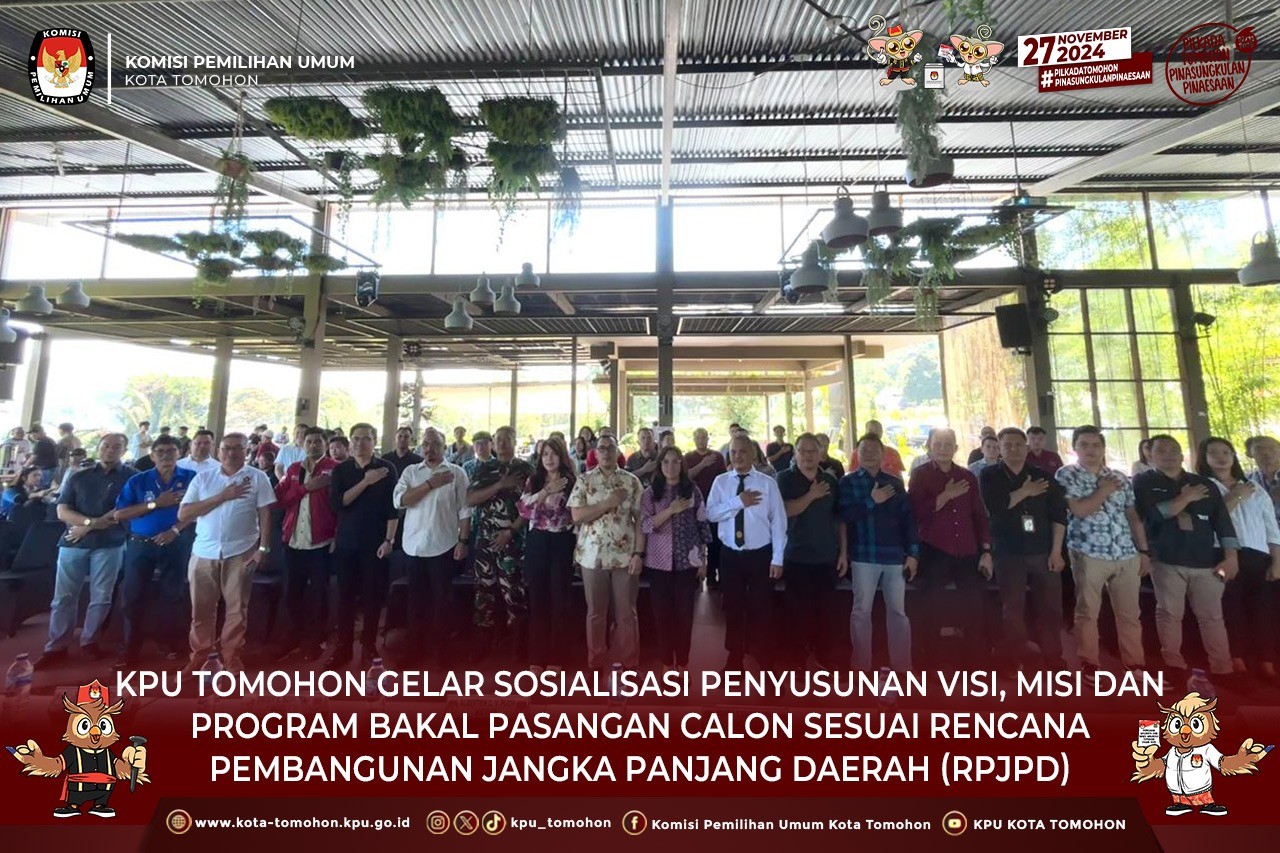 Tomohon, kota-tomohon.kpu.go.id - KPU Tomohon Gelar Sosialisasi terkait Penyusunan Visi, Misi, dan Program Bakal Pasangan Calon sesuai Rencana Pembangunan Jangka Panjang Daerah (RPJPD), Jumat 19/07/2024 bertempat di Jhoanie Hotel Tomohon.