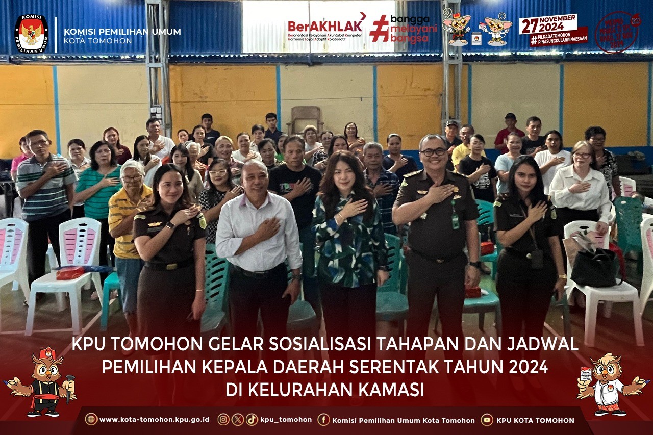 Tomohon, kota-tomohon.kpu.go.id - Komisi Pemilihan Umum (KPU) Kota Tomohon menggelar Sosialisasi Tahapan dan Jadwal Pemilihan Kepala Daerah Serentak Tahun 2024, bertempat di Kelurahan Kamasi, Selasa (19/11/2024).