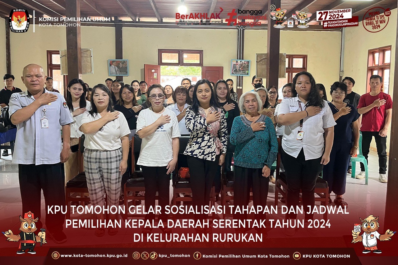Tomohon, kota-tomohon.kpu.go.id - Komisi Pemilihan Umum (KPU) Kota Tomohon menggelar Sosialisasi Tahapan dan Jadwal Pemilihan Kepala Daerah Serentak Tahun 2024, bertempat di Kelurahan Rurukan, Kamis (21/11/2024).