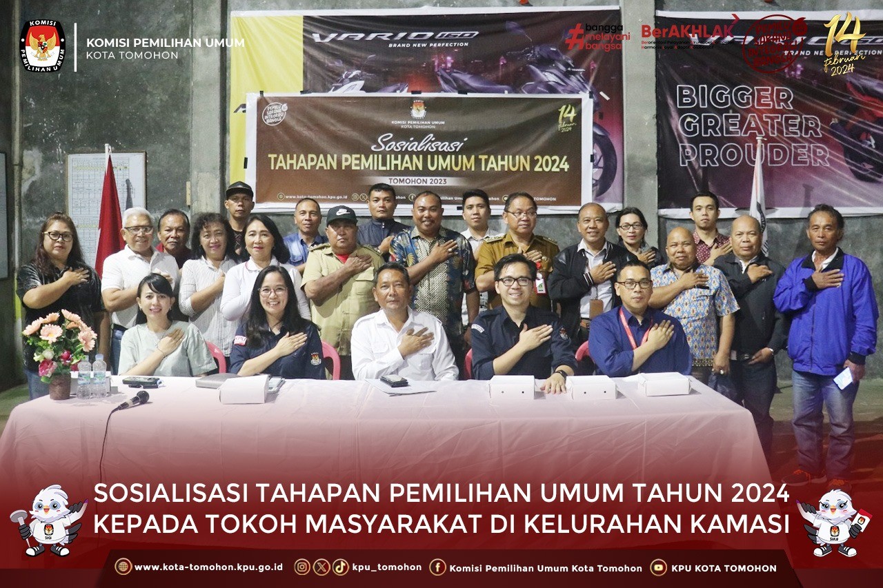 Tomohon, kota-tomohon.kpu.go.id - KPU Kota Tomohon melaksanakan kegiatan sosialisasi Tahapan Pemilu Tahun 2024 kepada Tokoh Masyarakat yang dilaksanakan di di Kelurahan Kamasi Kec.Tomohon Tengah dengan menghadirkan Narasumber Kasat Intel Polres Kota Tomohon Iptu Slamet.