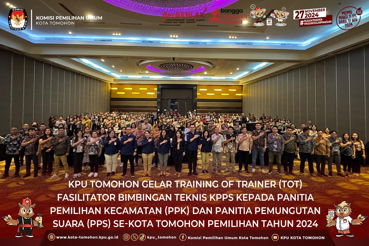 Tomohon, kota-tomohon.kpu.go.id - KPU Kota Tomohon menggelar kegiatan Training of Trainer (ToT) untuk fasilitator Bimbingan Teknis (Bimtek) kepada seluruh Panitia Pemilihan Kecamatan (PPK) dan Panitia Pemungutan Suara (PPS) se-Kota Tomohon berlangsung mulai 5 s.d 7 November 2024, bertempat di Grand Kawanua Novotel Manado . Kegiatan ini merupakan bagian dari persiapan menjelang Pemilihan Tahun 2024. Guna meningkatkan kapasitas serta pemahaman PPK dan PPS se-Kota Tomohon dalam menjalankan tugasnya, khususnya terkait dengan tahapan pemungutan suara dan penghitungan suara.