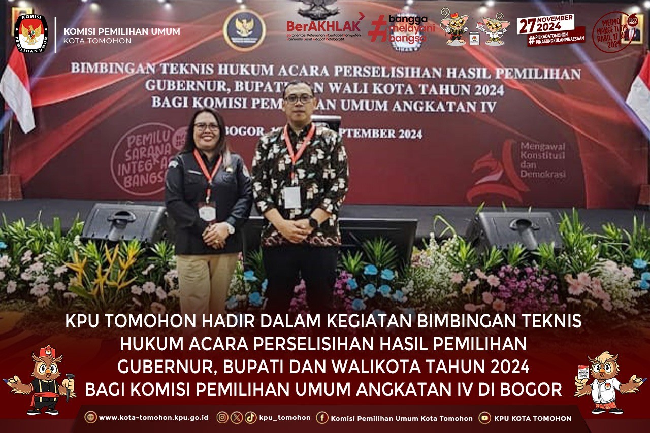 Tomohon, kota-tomohon.kpu.go.id - Ketua Divisi Hukum dan Pengawasan Youne Y. P. Simangunsong bersama Kasubag Teknis Penyelenggara Pemilu dan Hukum mengikuti kegiatan Bimbingan Teknis Hukum Acara Perselisihan Hasil Pemilihan Gubernur, Bupati dan Walikota Tahun 2024 bagi Komisi Pemilihan Umum Angkatan IV, di Bogor, 18 s. 20 September 2024.