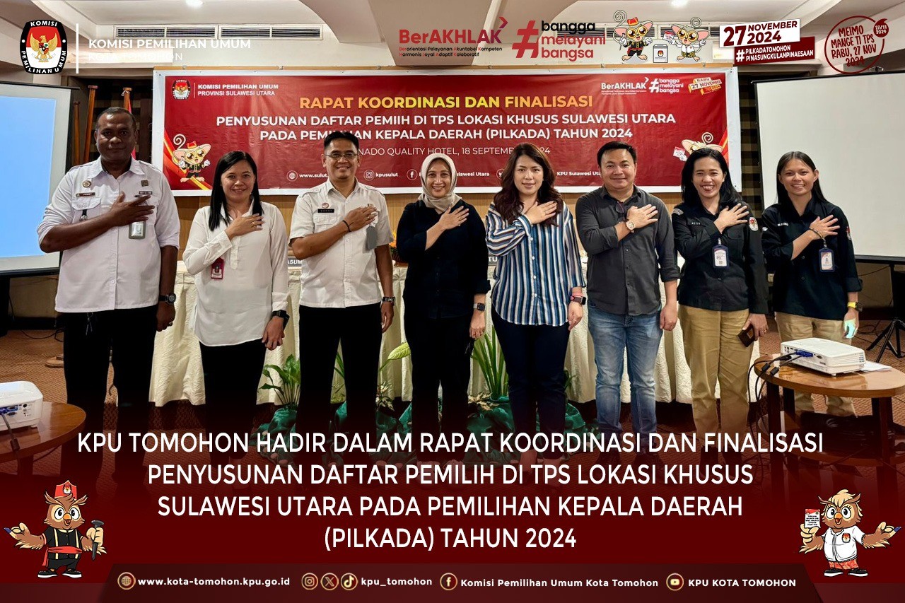 Tomohon, kota-tomohon.kpu.go.id - KPU Kota Tomohon bersama dengan Bawaslu Kota Tomohon, Dinas Kependudukan dan Pencatatan Sipil Kota Tomohon, LPKA Kelas II Tomohon dan LPP Kelas IIB Manado mengikuti kegiatan Rapat Koordinasi dan Finalisasi Penyusunan Daftar Pemilih di TPS Lokasi Khusus Sulawesi Utara pada Pemilihan Kepala Daerah (Pilkada) Tahun 2024, bertempat di Manado Quality Hotel, Rabu (18/09/2024).