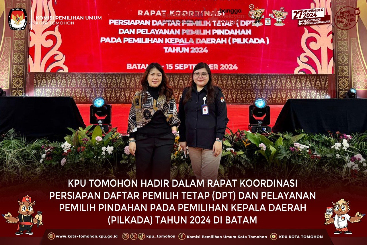 Tomohon, kota-tomohon.kpu.go.id - Ketua Divisi Perencanaan, Data dan Informasi Arinny Y. Poli bersama Operator Sidalih Prisca Lombogia menghadiri kegiatan Rapat Koordinasi Persiapan Daftar Pemilih Tetap (DPT) dan Pelayanan Pemilih Pindahan pada Pemilihan Kepala Daerah (Pilkada) Tahun 2024 di Batam, 11 s.d 14 September 2024.