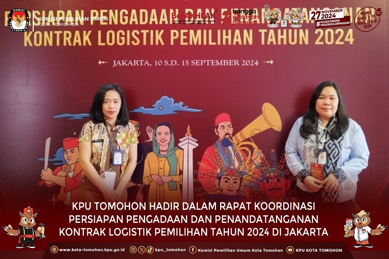 Tomohon, kota-tomohon.kpu.go.id - Komisi Pemilihan Umum (KPU) Kota Tomohon menghadiri Rapat Koordinasi Persiapan Pengadaan dan Penandatanganan Kontrak Logistik Pemilihan Tahun 2024 di Jakarta, 12 s.d 15 September 2024.
