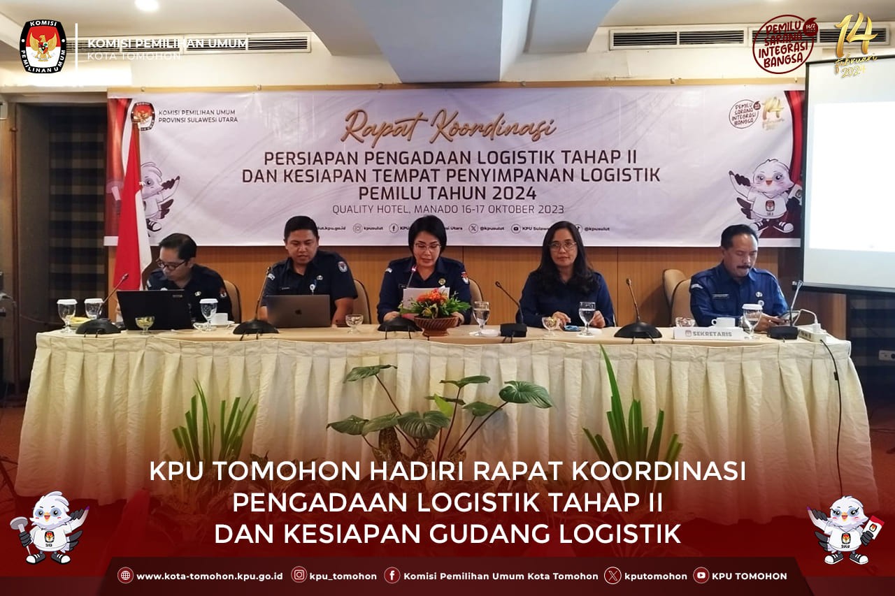 Tomohon, kota-tomohon.kpu.go.id - Ketua KPU Kota Tomohon Albertien G. V. Pijoh, Sekretaris Anita S. Tampi dan Kepala Sub Bagian Keuangan, Umum dan Logistik Evans E. W. Tulungen yang juga merupakan PPK KPU Kota Tomohon mengikuti Rapat Koordinasi Persiapan Pengadaan Logistik Tahap II dan Kesiapan Tempat Penyimpanan Logistik Pemilu Tahun 2024, di Quality Hotel Manado, yang berlangsung selama 2 (dua) hari 16-17 Oktober 2023.