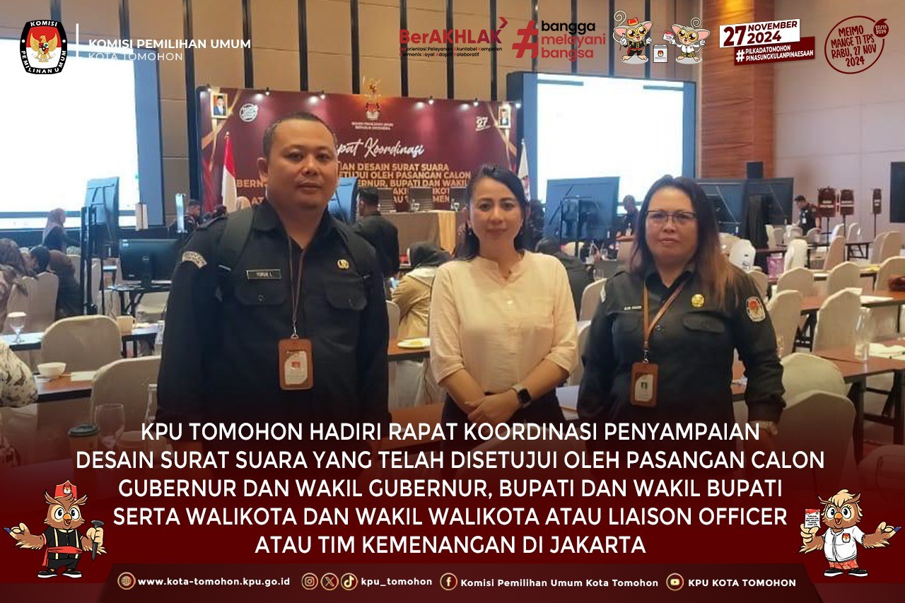 Tomohon, kota-tomohon.kpu.go.id - Komisi Pemilihan Umum (KPU) Kota Tomohon menghadiri kegiatan Rapat Koordinasi penyampaian Desain Surat Suara yang telah disetujui oleh Pasangan Calon Gubernur dan Wakil Gubernur, Bupati dan Wakil Bupati serta Walikota dan Wakil Walikota atau Liaison Officer (LO) atau atau Tim Kemenangan yang digelar oleh KPU Republik Indonesia, di Novotel Jakarta Mangga Dua Square, 1 s.d 3 Oktober 2024.
