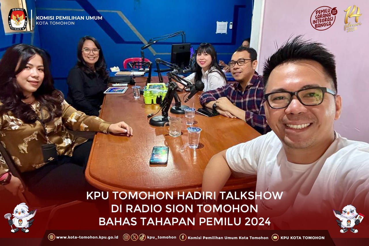 Tomohon, kota-tomohon.kpu.go.id - Ketua KPU Kota Tomohon Albertien G. V. Pijoh, Anggota Rojer R. Datu, Deisy T. Soputan, Arinny Y. Poli dan Youne Y. P. Simangunsong hadir dalam talkshow membahas tahapan Pemilu 2024 di Radio Sion Tomohon, Rabu 01 November 2023.