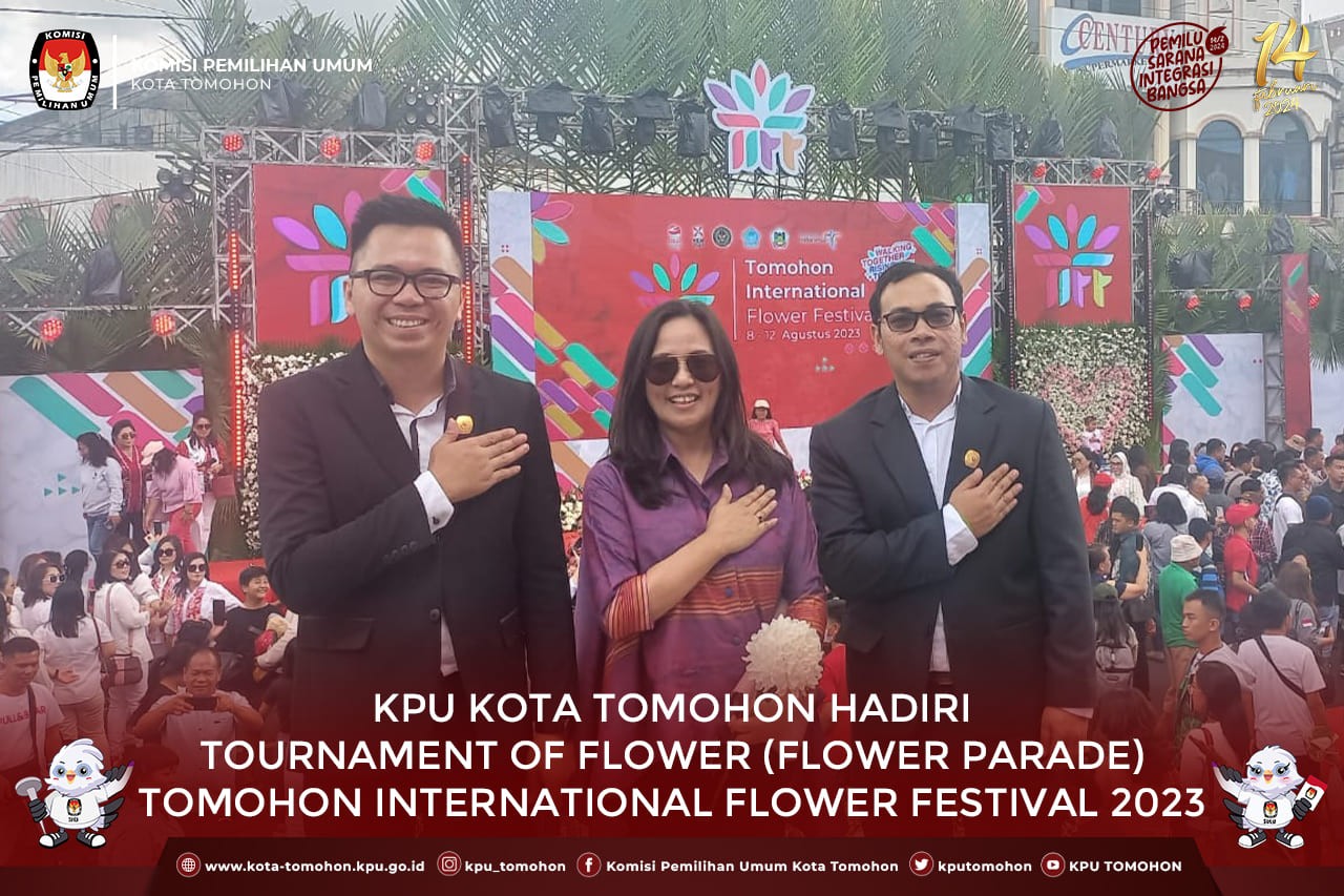 Tomohon, kota-tomohon.kpu.go.id - Ketua KPU Kota Tomohon Albertien G. V. Pijoh, Anggota Rojer R. Datu, dan Youne Y. P. Simangunsong menghadiri Tournament Of Flower (Flower Parade) Tomohon International Flower Festival di Kompleks Menara Alfa Omega Kota Tomohon, Sabtu 12 Agustus 2023.