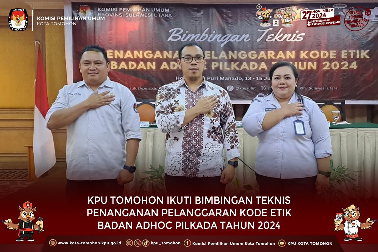 Tomohon, kota-tomohon.kpu.go.id - Komisi Pemilihan Umum (KPU) Kota Tomohon mengikuti Bimbingan Teknis Penanganan Pelanggaran Kode Etik Badan Adhoc Pilkada Tahun 2024 yang diselenggarakan oleh KPU Provinsi Sulawesi Utara, bertempat di Hotel Gran Puri Manado, 13 s.d 15 Juni 2024.